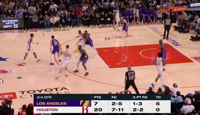 第三节风云突变,火箭轰出20-7攻击波,失误对比湖人5次火箭0次,火箭一举追平反超,扭转了局势。