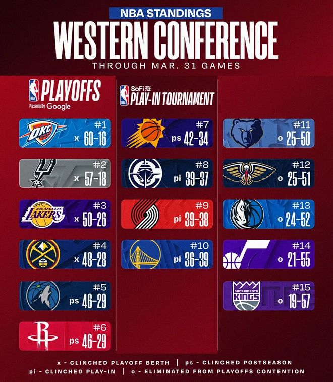 先给你们看看西部前三整个3月的战绩