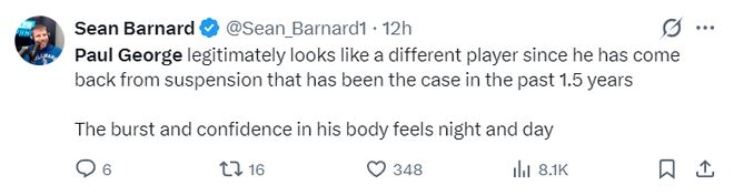 费城记者Sean Barnard写道:乔治回归赛场后确实展现出完全不同的风采,过去一年半他多次伤停/禁赛。他回归后身体的爆发力与自信心简直天壤之别。