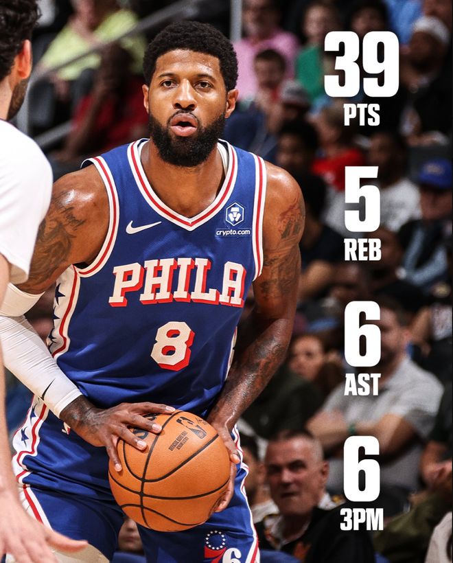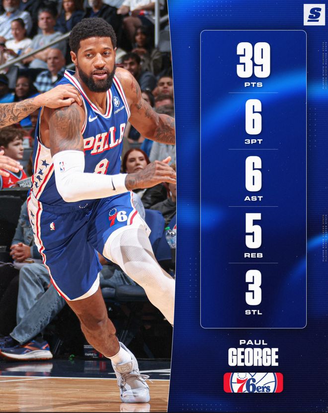 4.乔治成为费城队史首位39+5+5+5三分+3抢断+0失误的球员;