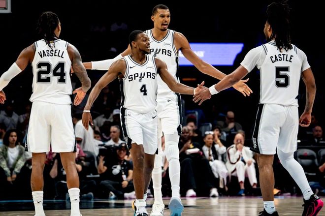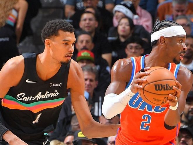 本赛季一直紧追雷霆的马刺,正是雷霆的最大克星!算上NBA杯赛,本赛季两队5次相遇,马刺4胜1负,处于绝对优势!马刺克制雷霆的方式也简单,文班亚马的各种错位优势,雷霆防守球员要么矮,要么慢。而马刺拥有能车轮战消耗限制亚历山大的能力,比如福克斯+哈珀+瓦塞尔+卡斯尔!最关键的是,雷霆的阵地战和三分手感并不稳定。而马刺,也拥有极佳的防守统治力。本赛季马刺场均119.7分联盟第三,场均控制失分111.3联盟第七;进攻效率119.4联盟第五,防守效率111.1联盟第三!净效率值+8.3,SRS值8.38,均仅次于雷霆!