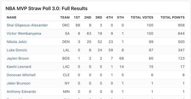 据ESPN最新一期MVP模拟投票统计,亚历山大狂揽88张第一顺位选票,总得分高达958分,以断层优势领跑全联盟。