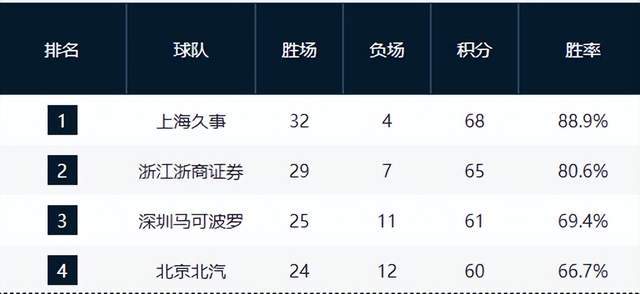 上海17连胜锁定第一,黑马巩固第3,4队争第4,广东占优,辽宁第9