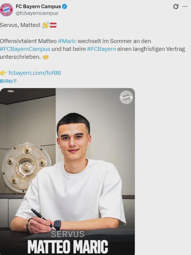 官方:拜仁宣布从萨尔茨堡红牛签下了新星马特奥-马里奇。