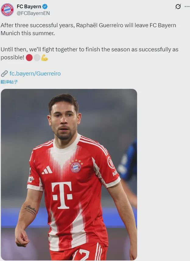 官方:拜仁宣布格雷罗决定在今夏自由转会离队。