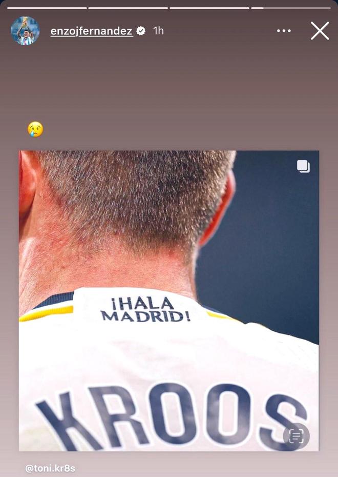 这很可能并不只是嘴上说说而已,就在2024年5月21日托尼-克罗斯宣布退役后不久,恩佐就在个人社交媒体上发表动态表达了对这位德国足坛巨星的不舍。