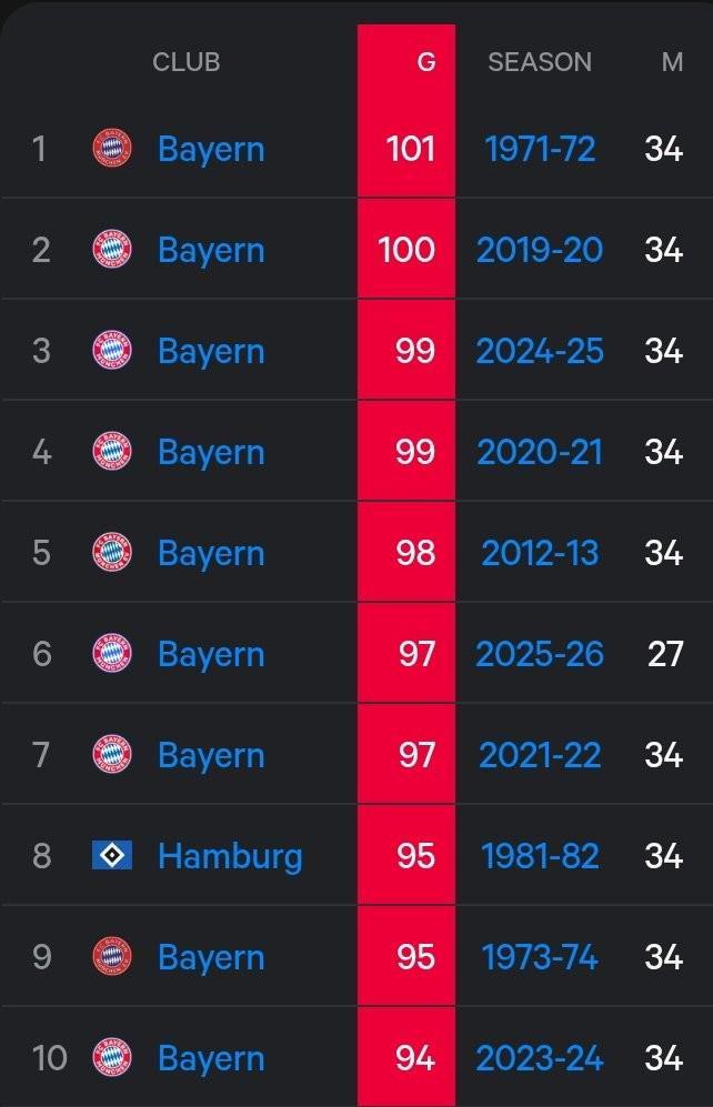 • 还有7轮,拜仁本赛季进球数已位列德甲历史第六位