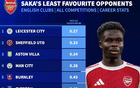 • 萨卡14次对阵曼城只造4球,生涯英格兰范围内所有对手第四低